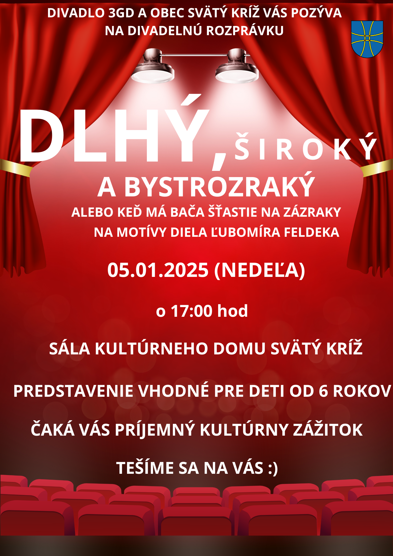 Divadlo 3GD a obec Svätý Kríž Vás pozýva na divadelnú rozprávku Dlhý, široký a bystrozraký dňa 5.1.2025 (nedeľa) o 17,00 hodine v sále kultúrneho domu Svätý Kríž.