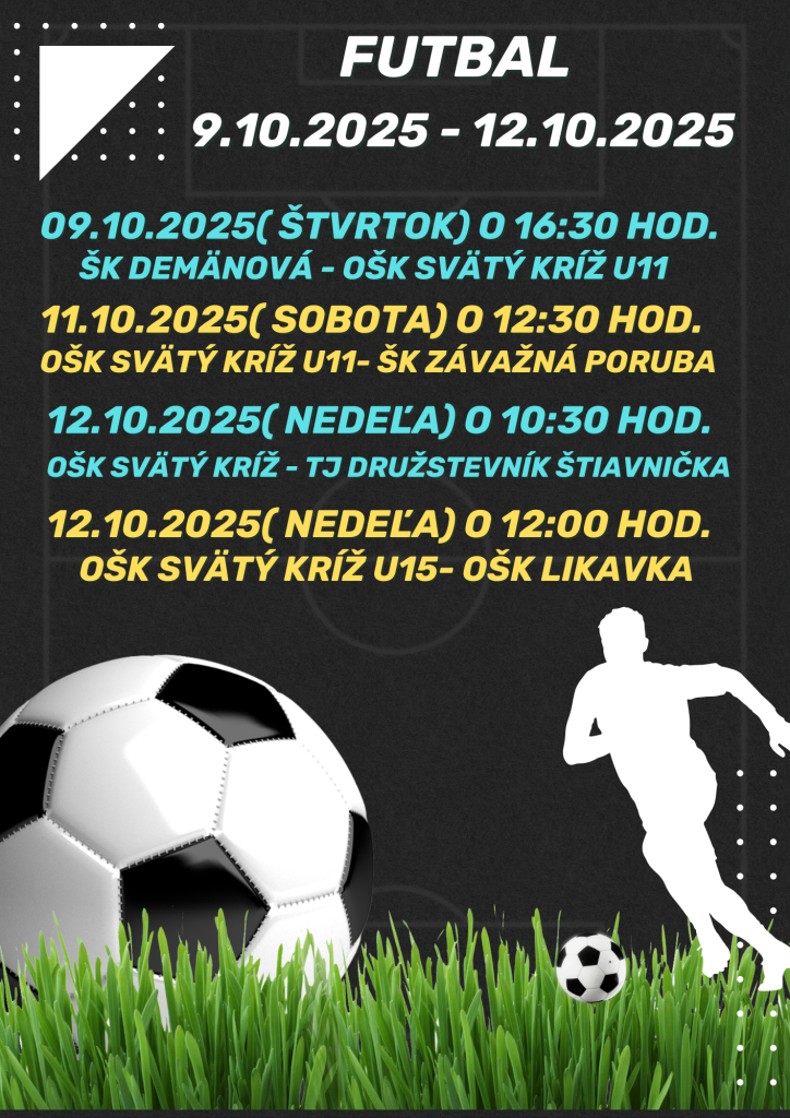 Príďte podporiť naše družstvá na futbalových zápasoch, ktoré sa uskutočnia 9. až 12. októbra 2025. Tešíme sa na vašu účasť a veríme, že si vychutnáte skvelú atmosféru.
