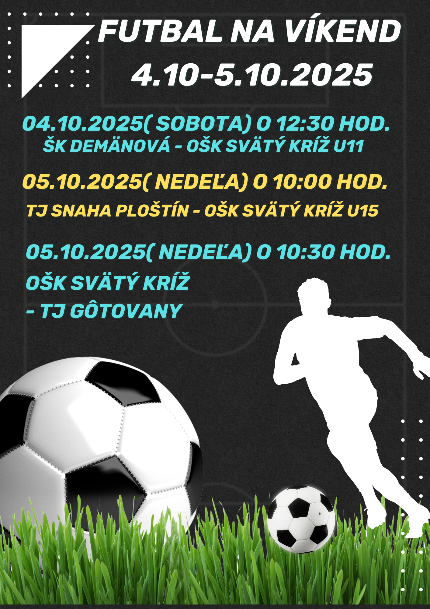 V sobotu 4. októbra 2025 a nedeľu 5. októbra 2025 sa uskutočnia futbalové zápasy, na ktoré vás srdečne pozývame. Je to skvelá príležitosť, ako podporiť naše družstvá a zažiť jedinečnú atmosféru. Príďte s rodinou a priateľmi, aby ste spoločne prežili vzrušujúce chvíle na ihrisku. Tešíme sa na vašu účasť a veríme, že sa vám podujatie bude páčiť.