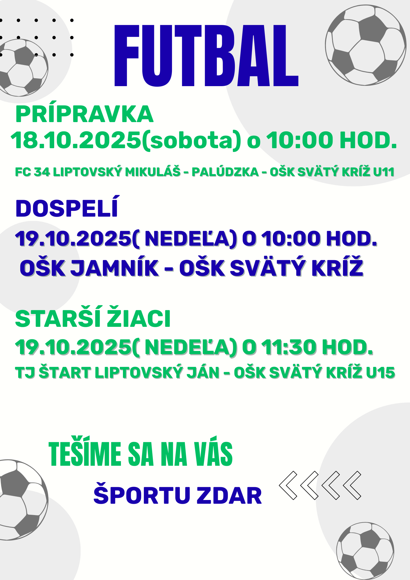 Príďte podporiť naše družstvá na futbalových zápasoch, ktoré sa uskutočnia 18. až 19. októbra 2025. Tešíme sa na vašu účasť a veríme, že si vychutnáte skvelú atmosféru.