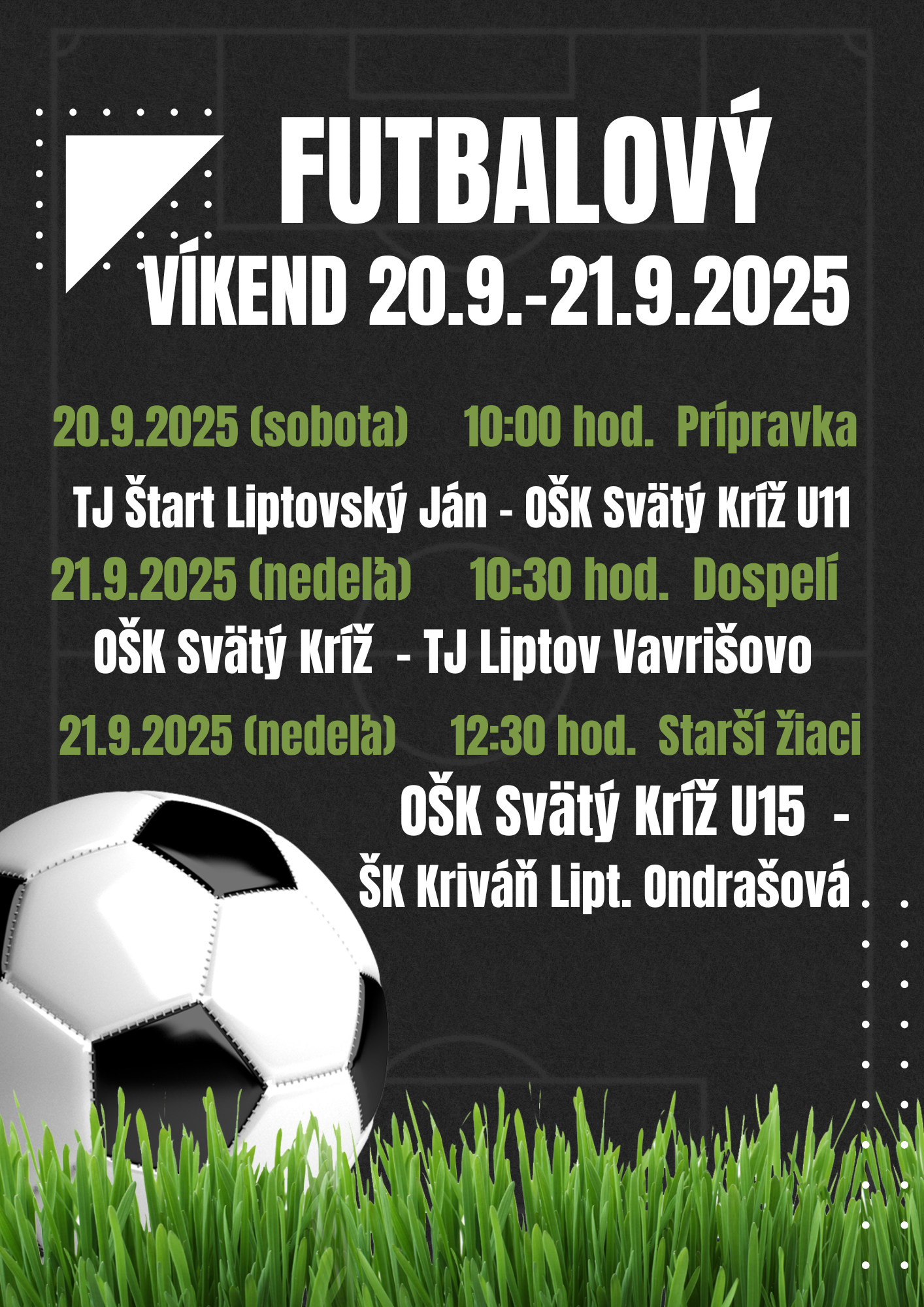 V dňoch 20. a 21. septembra 2025 sa uskutoční futbalový víkend, na ktorý srdečne pozývame všetkých fanúšikov a priaznivcov futbalu. Príďte povzbudiť naše mužstvá a užiť si skvelú atmosféru. Vaša podpora je veľmi dôležitá a prispieva k úspechu našich tímov. Tešíme sa na vás a spoločne zažijeme nezabudnuteľné chvíle na štadióne.