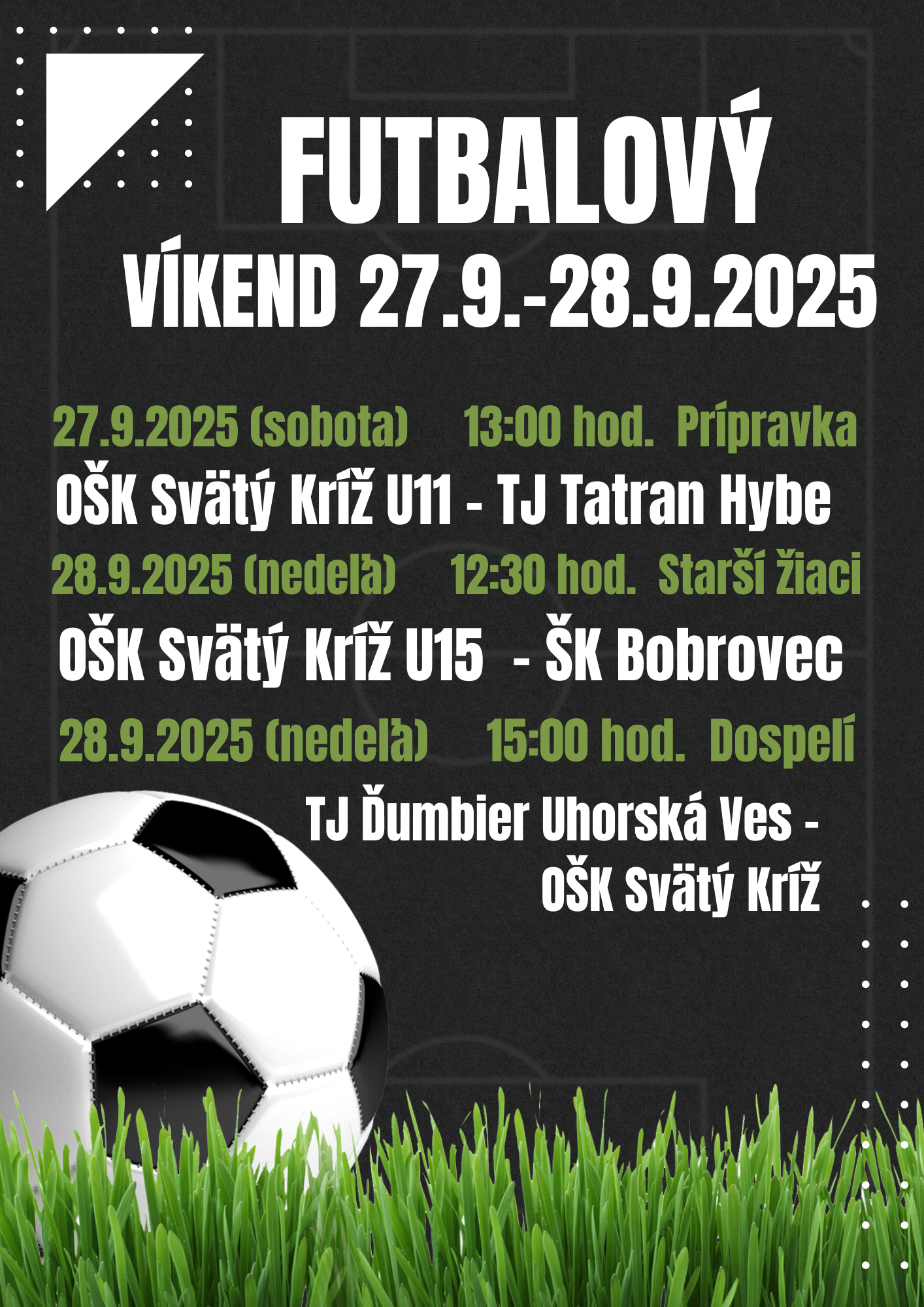 Všetkých milovníkov futbalu srdečne pozývame na víkendové zápasy, ktoré sa uskutočnia 27. a 28. septembra 2025. Príďte a podporte naše miestne mužstvá, ktoré sa s nadšením pripravujú na tieto dôležité stretnutia. Vaša prítomnosť a povzbudzovanie sú pre hráčov veľkou motiváciou a prispievajú k vytvoreniu skvelej atmosféry.
