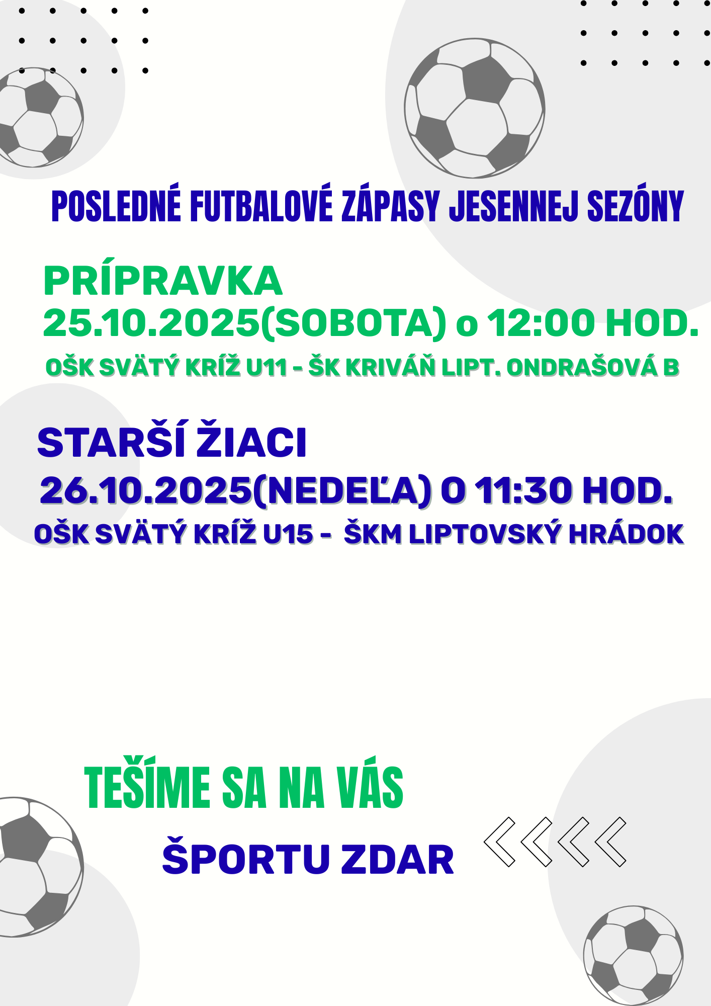Príďte podporiť naše družstvá na posledných futbalových zápasoch jesennej sezóny, ktoré sa uskutočnia 25. až 26. októbra 2025. Tešíme sa na vašu účasť a veríme, že si vychutnáte skvelú atmosféru.